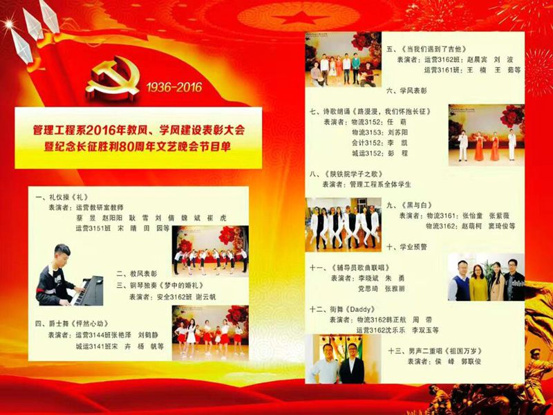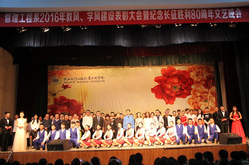 10月20日晚,管理工程系2016学年教风、学风建设表彰大会暨纪念长征胜利80周年文艺晚会在临渭校区文体中心隆重举行。公司党委副书记杨云峰教授、党委委员、学工部亢新河处长、教务处、思政部等职能部门负责人,管理工程系主任、总支书记和该系全体辅导员、班主任与2015级、2016级员工一起观看演出。